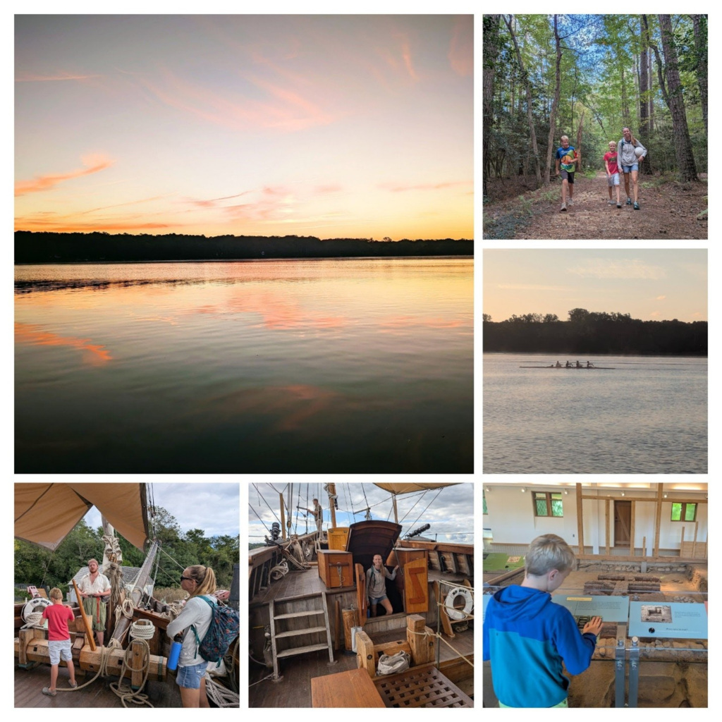 St. Mary’s City was the first permanent settlement in Maryland, and they have restored some of the original buildings in a walking tour. Within walking distance was the St. John’s historical settlement, an archaeological museum built around the remains of a 1638 home, was a fascinating visit. Also nearby is the wooden tall ship Maryland Dove, a historical reimagination of the 1634 Maryland Dove, which was the smaller of the two ships used to settle St Mary’s City. The boys had a fun time asking the crew about the cannons, the sailing speed, and whether they could climb the mast.
