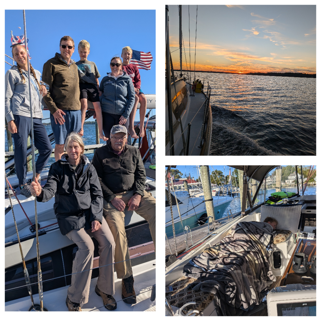 We said our farewells to my parents and sister at another cute restaurant in St. Michael’s. We can see why this is a standard stop for Chesapeake Bay cruisers. We need to head south before the southerly wind picks up. We’re keeping an eye on a potential weather window developing next week to round Cape Hatteras, since we don’t want to be stuck in Norfolk when it gets cold.