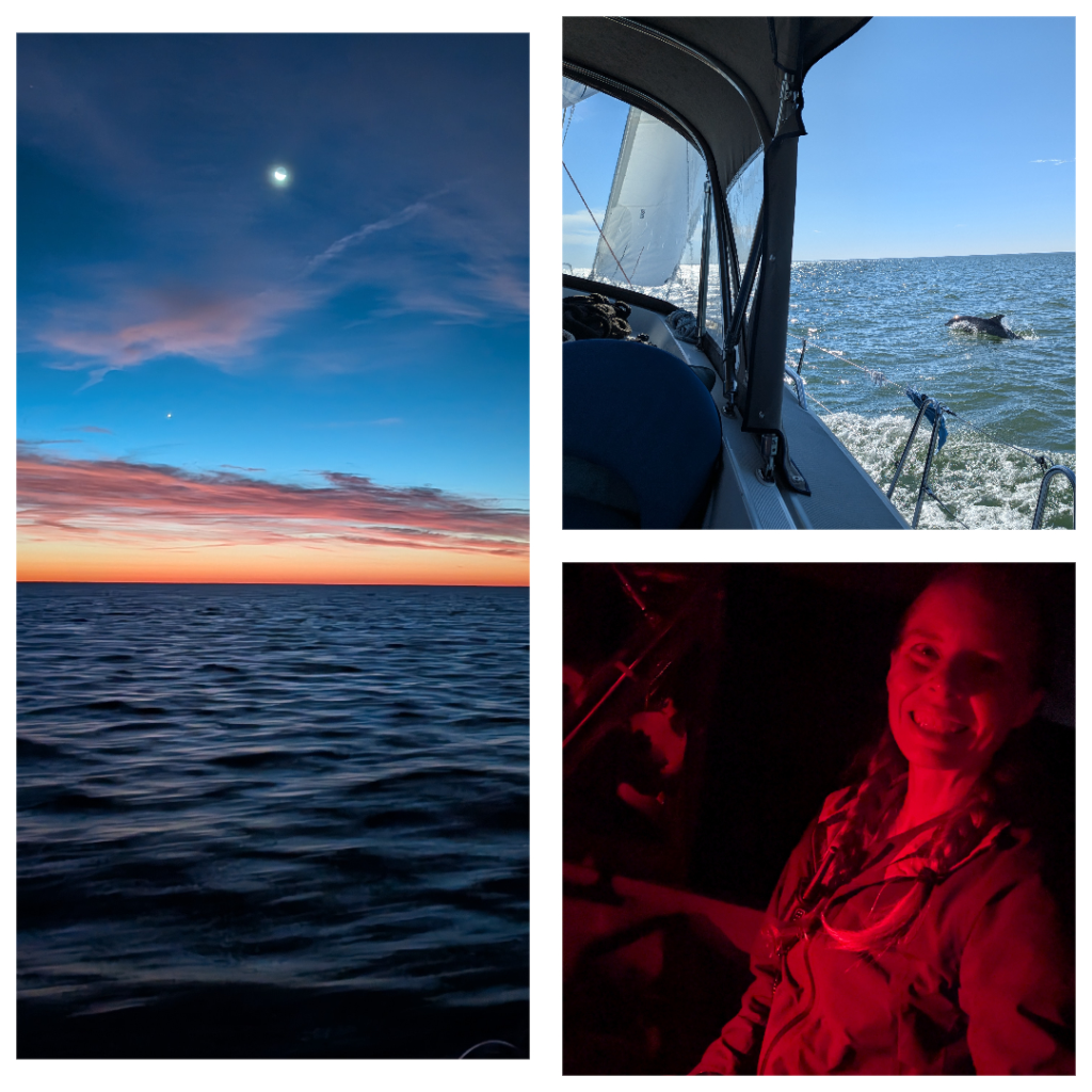 We left around 11 am and had a mix of sailing and motor-sailing, trying to beat the sunset into Solomons. Our first hour was into 20 kts of wind, which wasn’t very fun. We had a sliver of sail out for stability, and motored into it. After that, we turned to head south and had a very pleasant following wind pushing us south. We made decent time, and approached Solomons as light was fading. With how calm the night was forecasted to be, we decided to just anchor in the wide open bay.